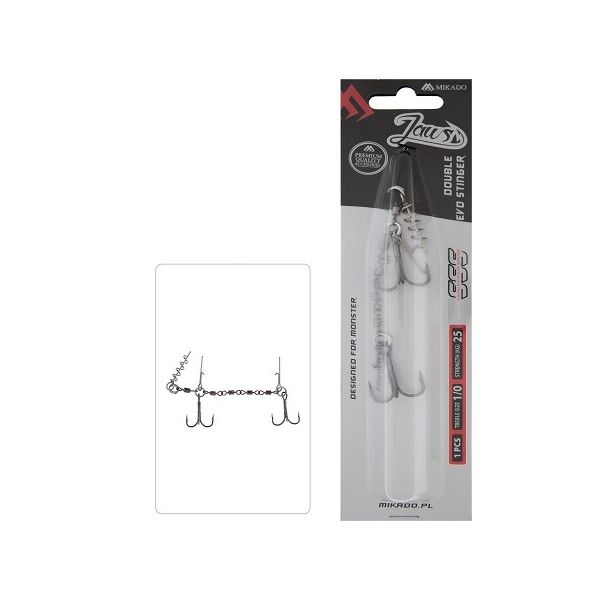Podwójna dozbrojka z wkrętem i pinami. Zastosowanie kilku krętlików pozwoliło uzyskać bardzo mocne połączenie, które eliminuje możliwość wytworzenia zjawiska dźwigni podczas holu, dodatkowo stabilizując gumę. Rozmiar XL dedykowany do największych przynęt.