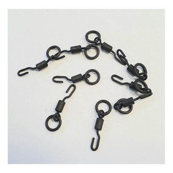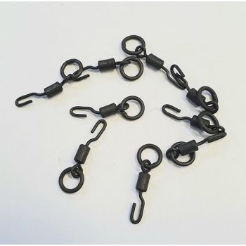 Krętlik z kółkiem z szybkozłączką dedykowany do przyponów typu Ronnie Rig. Krętlik ma specyficzny klips, który ułatwia założenie krętlika na oczko haczyka. Pamiętaj o konieczności zabezpieczenia tego połączenia rurką termokurczliwą najlepiej w rozmiarze 1,6 mm.