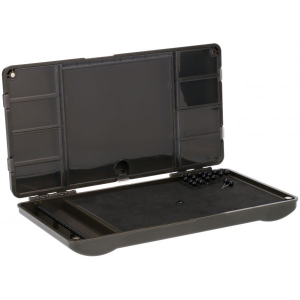 Pudełko "kombajn" z wytrzymałego plastiku do przechowywania akcesoriów karpiowych. Pudełko zawiera wystarczająco dużo przegródek na haki, krętliki, stopery, pozycjonery i wszystkie inne potrzebne akcesoria. W swoim wyposażeniu ma również piórnik na przypony (1szt.) i mniejsze pudełeczka(4szt.), a także miarkę do przyponów(1szt.).