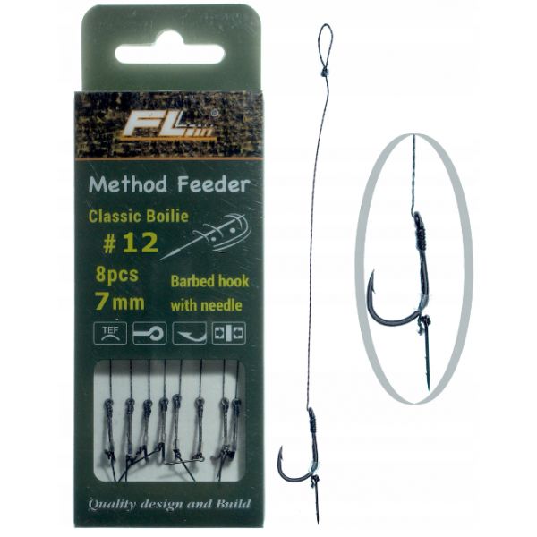 Doskonałej jakości, gotowe przypony do popularnego Method Feeder'a. Dostępne w wielu wersjach z włosem i gumką do pelletu oraz z hakami z zadziorem i bez zadziora. Zawiązane na najwyższej klasy żyłce, z super ostrymi, kutymi hakami.