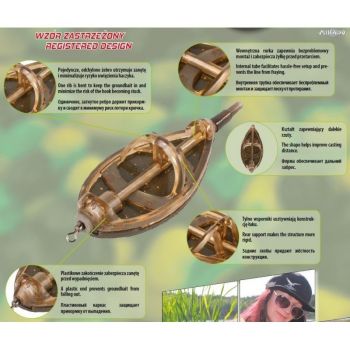 Koszyczek wykonany z najlepszej jakości materiałów ( poliwęglan, ołów malowany proszkową farbą ). Aerodynamiczny kształt ułatwia osiąganie dalekich i celnych rzutów. Koszyki dostępne w kilku gramaturach 25, 35, 45, 60, 80 gr. Doskonale utrzymuje zanętę i przynętę podczas zarzucania zestawu.