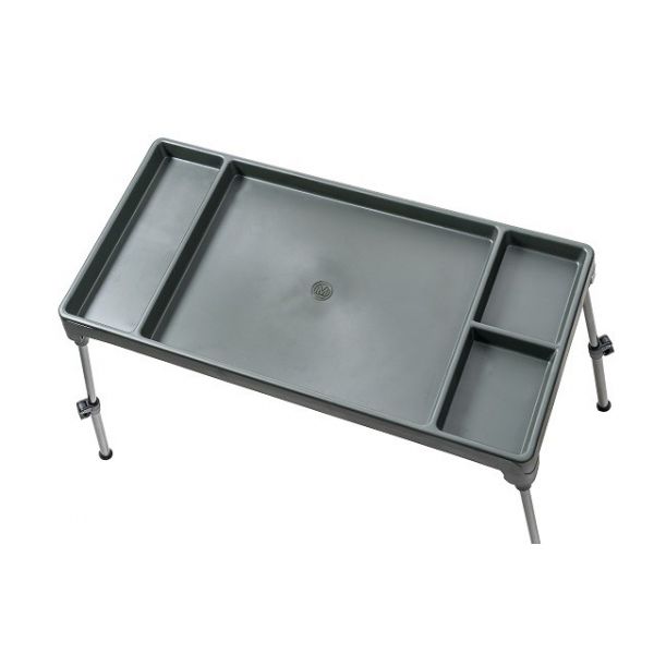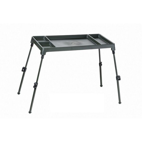 Duży stolik karpiowy z kilkoma komorami. Nogi osadzone są na bagnetowym złączu i po rozłożeniu blokowane śrubami mocującymi.