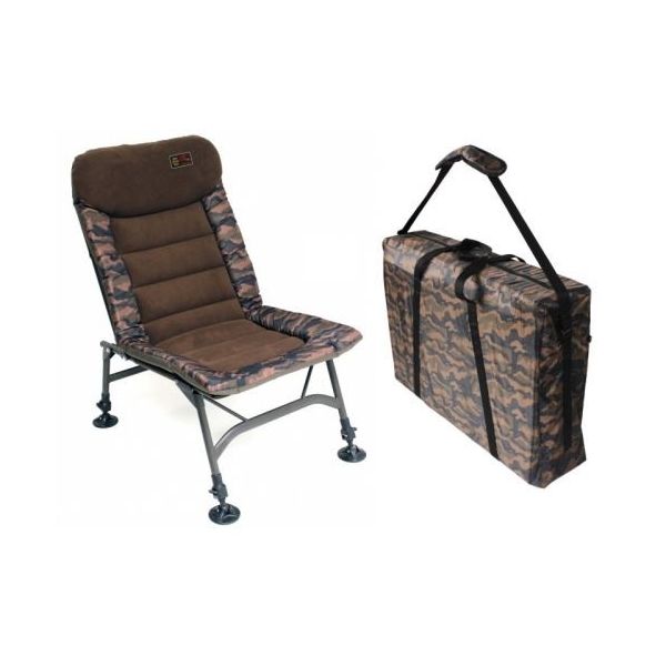 Pokrowiec jest wykonany z przyjemnego mikropolaru i na obwodzie pokrowca w kamuflażu Rip Stop. Wyróżnia się przede wszystkim atrakcyjnym wyglądem oraz bardzo mocno wyściełanym pokrowcem. Wędkarze z pewnością ucieszy system regulowanych nóżek z szerokimi stopkami zapobiegającymi zapadaniu się w błocie. Do wielkich zalet tego krzesła z pewnością należy bardzo prosty i praktyczny system rozkładania Wystarczy złożyć oparcie i nogi, a krzesło jest gotowe do wygodnego siedzenia. To bezkonkurencyjny model w swoim przedziale cenowym.