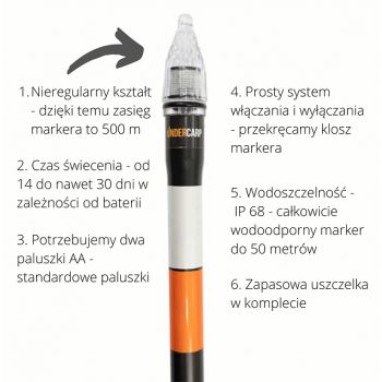Ciężarek odpinany, z systemem.Rurki w kolorze czarnym o średnicy 22 mm, dzięki czemu są znacznie wytrzymalsze i sztywniejsze. Zasięg widoczności do 500 m w przyjaznym warunkach pogodowych, zmieniliśmy klosz diody z okrągłego na nieregularny kształt. Dzięki temu światło bardziej się rozprasza i marker widoczny jest z większej odległości.