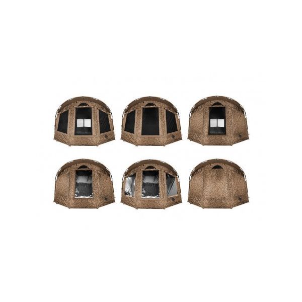 -W zestawie wpinany na zamek, w pełni odpinany przedni panel Ultra Brolly Camo Full Front z trzema opcjami drzwi: z przezroczystego PVC, z pełnego materiału Fox Camo i moskitiery Fox Camo