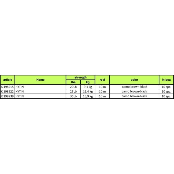 Bardzo mocna, szybko tonąca plecionka przyponowa. Jej ciemnozielony kolor sprawia, że jest praktycznie niewidoczna na dnie.