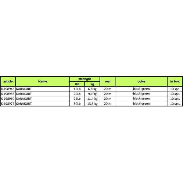 Bardzo miękka, mocna i szybko tonąca plecionka. Ma kolor zielony, idealna do używania wśród podwodnej roślinności.