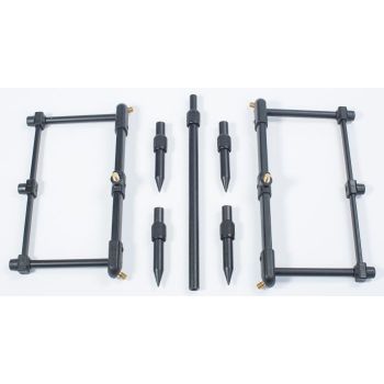 Aluminiowa rama, wzmocnione nylonowe okucia z tworzywa sztucznego, cam-lock system na buzz-barach, buzz-bar na 3 wędki, tylny buzz-bar długości 36,5cm, przedni buzz-bar 40cm, rama główna regulowana w zakresie od 55 cm do 100 cm, nogi regulowane w zakresie od 30cm do 52cm (4szt.), dodatkowe nogi przedłużające od 50cm do 88cm (2szt.), całkowita waga 1,895kg,