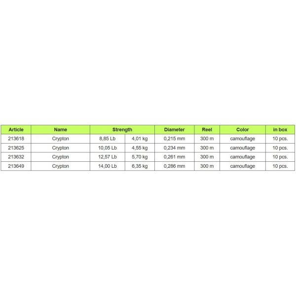 Crypton, to żyłka dedykowana do methody feederowej oraz do połowu karpi. Jaki kolor jest tej żyłki? Nie możemy tego określić, ponieważ ta żyłka zmienia swój kolor w zależności od głębokości w wodzie i ilości światła, od koloru zielonego, poprzez brązowy, a nawet czerwony.